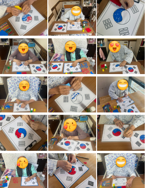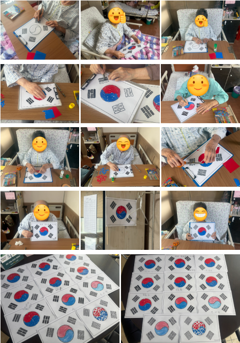 태극기 도안을 활용한 활동으로 환자분들이 직접 색종이와 색연필을 이용해 태극기를 완성해 보는 시간을 가졌습니다.